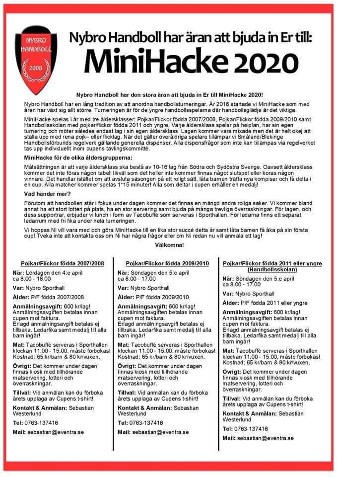 Nu är det dags igen! Vi kan stolt bjuda in till Minihacke 2020! MiniHacke är turneringen som vänder sig till de yngre spelarna i åldersklasserna: P/F födda 2007/2008, P/F födda 2009/2010 samt Handbollsskolan (födda 2011 och yngre). En turnering med fokus på handboll och att ha roligt där vi verkligen hoppas att Ni vill vara med! Vi startade cupen 2016 och den har ständigt utvecklats. Nu hoppas vi att Ni vill vara med och göra den till en succé i år igen! All information och inbjudan finns i det bifogade dokumentet. Vänligen notera att cupen har begränsat antal platser så principen först till kvarn gäller! MiniHacke 2020 spelas helgen 4-5 april. P/F födda 2007/2008 spelar under lördagen medan P/F födda 2009/2010 samt Handbollsskolan spelar under söndagen. Som vanligt erbjuder vi lunchservering under cupen likväl som det kommer att finnas aktiviteter och en välsorterad kiosk! Har Ni frågor, funderingar eller vill anmäla ett lag, tveka inte att höra av Er! Nybro Handboll 20 nov 2019 0kommentarer