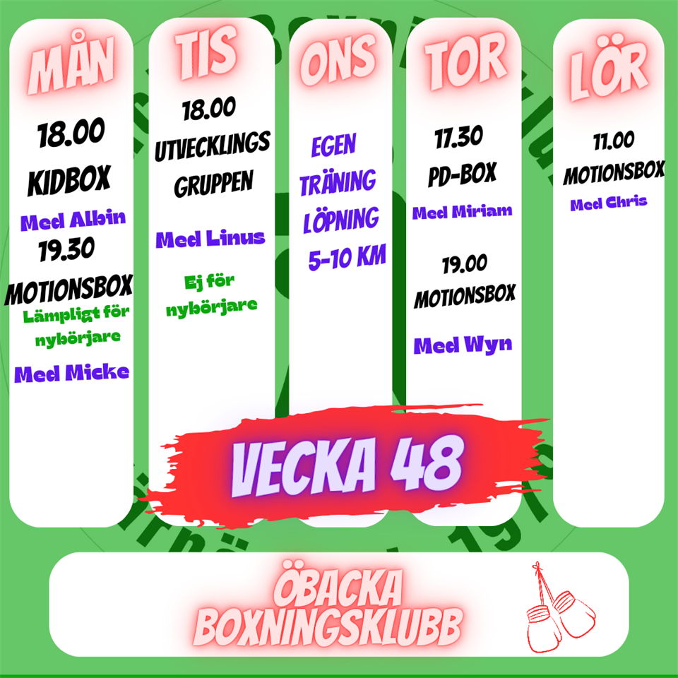 Kort vecka med ÖBK. Kom och träna på måndag och tisdag. Torsdag endast om du tillhör Parkinsonsboxningen! ? #teamöbk Öbacka Boxningsklubb 27 okt 2024 0kommentarer