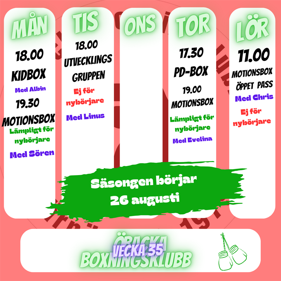Vi gör oss redo för ny termin och säsong! Nytt för denna terminen är att Parkinsonsboxningen är på torsdagar istället för onsdagar samt att tiderna skiljer sig något på olika pass. Ni som vill bli medlemmar i klubben ska betala avgiften FÖRST och ansöka om medlemskap EFTER. För frågor om träning hör av er till Linus på 0763053844🏃?🏃 För frågor om sponsring hör av er till Micke på 0702656366. Varmt välkomna till en ny säsong med Öbacka Boxningsklubb #öbackabk