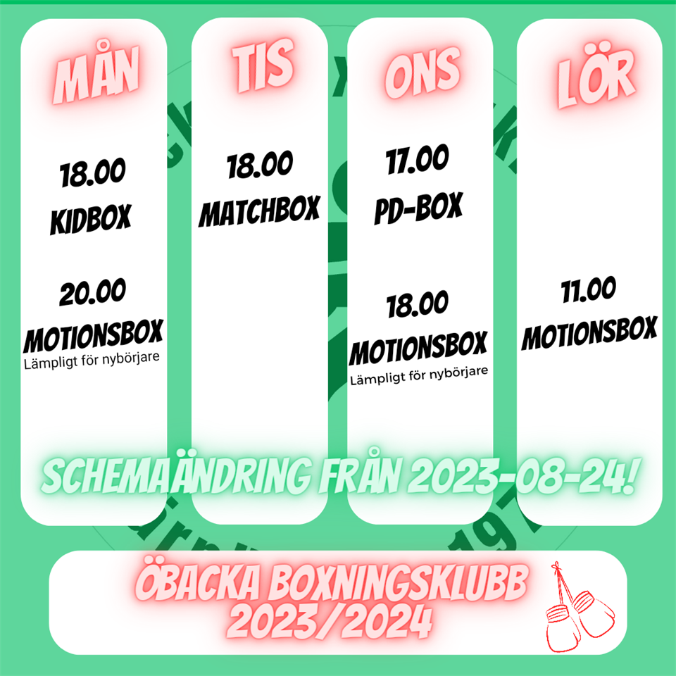 Terminsstart måndag V35 OBS en ändring har skett i schemat OBS För denna terminen gäller nya tider och dagar för vissa pass. Spana in veckoschemat och skriv upp i kalendern vilka dagar ni eller era barn ska träna på. Kidbox - boxning för ålder 6-12. Motionsbox - boxning för ålder 13-110. Matchbox - avtalat med tränare PD-BOX - boxning för er med Parkinsons. Frågor? Ring Linus på 0763053844 Varmt välkomna till ÖBK! #boxning #öbackabk #härnösand