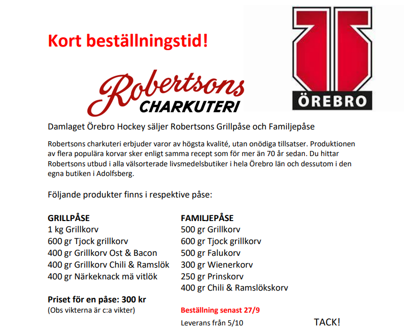Vår familj brukar sälja Robertsons till många, nu har vi fått så många förfrågningar om korv till älgjakten att vi öppnar upp för en femdagars rallyförsäljning: start idag - slut på måndag 27/9. Om någon mer vill sälja några Grill- eller Familjepåsar så går det fint, informationsblad hittar du här under Mer - Dokument. En lista att skriva ut och en bild som passar att dela. Observera prishöjningen från sist vi sålde, nu kostar en påse 300 kr och vår vinst är 50 kr/påse. Ta in beställningar och meddela mig senast mån 27/9. Vi hämtar påsarna tis 5/10 och tar med till träningen på kvällen. A-lag Damer 23 sep 2021 1kommentar