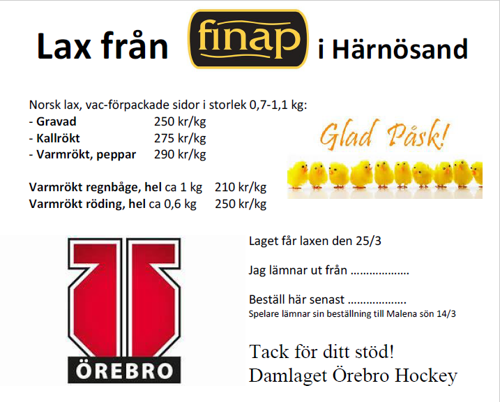 Nu finns möjlighet för dem som vill att sälja lax med levereras lagom till påsk. Beställningslapp med sorter och priser hittar du under "Dokument" Där finns också en bild som kan delas. Som vanligt går vinsten för det du säljer i första hand till din egen pott. Beställ dina laxar av mig senast sön 14/3 kl 20.00 Laxen levereras till Örebro tors 25/3, troligast kvällstid ihop med träning. Vill du veta hur du ligger till med din pott, hör av dig så återkommer jag så snart jag har möjlighet. NeH har vi klart med nu och ni som ställde upp och jobbade kan tillgodoräkna er 139 kr/tim. Vi fick beröm för ett mycket bra jobb och att vi fixade det trots att vi fick felaktig info om jobbet innan. Stort tack till er som ställde upp och många med så kort varsel! A-lag Damer 24 feb 2021 1kommentar