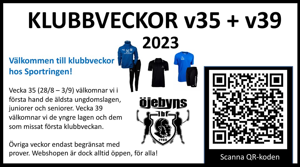 Denna första klubbvecka pågår mellan måndag 28 augusti till söndag 3 september och gäller när Sportringen i Piteå har sina öppettider för att pröva ut kläder på plats. Beställningarna görs med via Onlinebutiken enligt nedan. Klubbveckan är till för ÖIBFs medlemmar, för att kunna prova ut och beställa föreningstextiler till rabatterade priser. Medlemmarna ges även förmånen att handla övriga produkter i butiken till 20% rabatt under hela veckan. (Erbjudandet gäller ej på cyklar, hockeyutrustning, REA-/ kampanjvaror och kan ej kombineras med andra erbjudanden.) Beställningar av textiler som avviker från klubbens profil görs lagvis efter föreningens godkännande och direkt till Sportringens klubbavdelning. FÖRENINGSPROFILEN Spelarnas kläder • Blå träningstischa, Oxdog Atlanta • Svarta träningsshorts, Oxdog Avalon • Svarta strumpor, Oxdog Fit Sock • Blå långärmad hoodie, Oxdog Glow Hood • Svarta träningsoverallbyxor, Oxdog Speed Pant Paket finns för: • 1 st. T-shirt och 1 par shorts • 2 st. T-shirts och 1 par shorts Ledarnas kläder • Svart ledarpiké (varje ledare som inte har fått tidigare erhåller en gratis), Oxdog Oxford • Svart långärmad hoodie, Oxdog X-Hood • Svarta träningsoverallbyxor, Oxdog Speed Pant EXTRA KLÄDER/UTRUSTNING Extra kläder/utrustning, som förstås är fritt att beställa extra också för spelare och ledare • Mörkblå Vinterjacka, Oxdog Fenix - padded jacket • Blå långärmad träningsoveralltröja, Oxdog Speed Jacket • Svart ryggsäck, Oxdog Ox1 Stick Backpack • Mörkblå keps, Oxdog X Flat Cap • Svarta Beachsandaler/Slippers, Oxdog Offcourt Slip Sandal • Svart vattenflaska 0,75L, Oxdog K2 Bottle UTPROVNING AV KLÄDER Utprovning av kläder kan göras under hela Klubbvecka 1, 28/8 - 3/9 under deras ordinarie öppettider: • Vardagar 07-18 • Lördag 10-15 • Söndag 12-16 Då gäller även 20% för medlemmar i hela Sportringen Piteås butik BESTÄLLNINGAR För att beställa och se alla erbjudanden scanna in QR koden eller besök Sportringens Webbsida för Öjebyns IBF online Betalning sker via Klarna på hemsidan. Produkterna finns att hämta i butiken när ni fått ett meddelande att det är färdigt. Normal leveranstid är 2-4 veckor från det att beställningarna är skickade. Avvikelser i leveransen kan ske utifrån leverantörernas aktuella lagerstatus eller vid avvikande önskemål gällande trycken. KONTAKT Vid frågor kontakta oss på: Facebook eller via E-post till Öjebyns IBF Sportringens Mejl ÖVRIGT • Vecka 35 (28/8 – 3/9) välkomnar vi i första hand de äldsta ungdomslagen, juniorer och seniorer. • Vecka 39 välkomnar vi de yngre lagen och dem som missat första klubbveckan. Övriga veckor endast begränsat med prover. Webshopen är dock alltid öppen, för alla! Välkomna till den nya säsongen hälsar // Styrelsen och sektionerna.