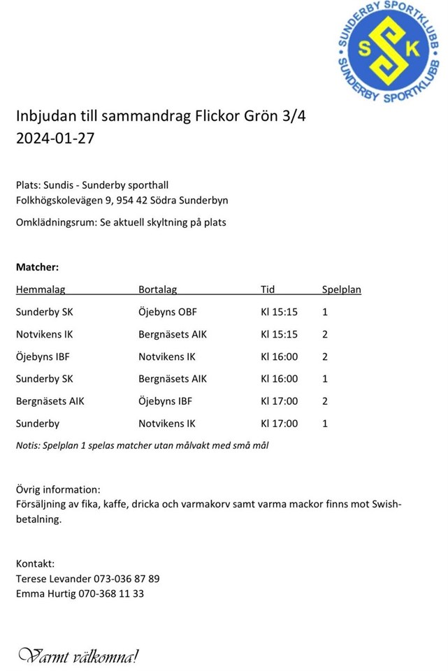 Nu är det dags för det tredje seriesammandraget. Denna gång är det Sunderby SK som arrangerar det. Vi samlas en halvtimme innan första matchen, dvs 14.45 Matchtider: 15:15 , 16:00 samt 17:00 Se bifogad bild för mer info :) F-2016 15 jan 2024 0kommentarer