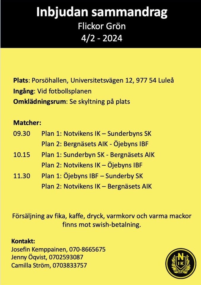 Nu är det dags för det sista seriesammandraget för denna säsong. Det är Notviken som arragerar detta och första matchen är 09:30 Vi samlas 09:00 Plats:Porsöhallen Adress:Universitetsvägen 12 977 54 Luleå Mvh Tränarna F-2016 27 jan 2024 1kommentar