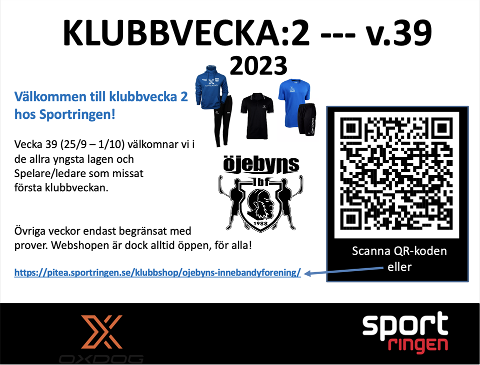 Denna andra klubbvecka pågår mellan måndag 25 september till söndag 1 oktober och gäller när Sportringen i Piteå har sina öppettider för att pröva ut kläder på plats. Beställningarna görs på/via Onlinebutiken enligt nedan. Klubbveckan är till för ÖIBFs medlemmar, för att kunna prova ut och beställa föreningstextiler till rabatterade priser. Medlemmarna ges även förmånen att handla övriga produkter i butiken till 20% rabatt under hela veckan. (Erbjudandet gäller ej på cyklar, hockeyutrustning, REA-/ kampanjvaror och kan ej kombineras med andra erbjudanden.) Beställningar av textiler som avviker från klubbens profil görs lagvis efter föreningens godkännande och direkt till Sportringens klubbavdelning. FÖRENINGSPROFILEN Spelarnas kläder • Blå träningstischa, Oxdog Atlanta • Svarta träningsshorts, Oxdog Avalon • Svarta strumpor, Oxdog Fit Sock • Blå långärmad hoodie, Oxdog Glow Hood • Svarta träningsoverallbyxor, Oxdog Speed Pant Paket finns för: • 1 st. T-shirt och 1 par shorts • 2 st. T-shirts och 1 par shorts Ledarnas kläder • Svart ledarpiké (varje ledare som inte har fått tidigare erhåller en gratis), Oxdog Oxford • Svart långärmad hoodie, Oxdog X-Hood • Svarta träningsoverallbyxor, Oxdog Speed Pant EXTRA KLÄDER/UTRUSTNING Extra kläder/utrustning, som förstås är fritt att beställa extra också för spelare och ledare • Mörkblå Vinterjacka, Oxdog Fenix - padded jacket • Blå långärmad träningsoveralltröja, Oxdog Speed Jacket • Svart ryggsäck, Oxdog Ox1 Stick Backpack • Mörkblå keps, Oxdog X Flat Cap • Svarta Beachsandaler/Slippers, Oxdog Offcourt Slip Sandal • Svart vattenflaska 0,75L, Oxdog K2 Bottle UTPROVNING AV KLÄDER Utprovning av kläder kan göras under hela Klubbvecka 2, 25/9 - 1/10 under deras ordinarie öppettider: • Vardagar 07-18 • Lördag 10-15 • Söndag 12-16 Då gäller även 20% för medlemmar i hela Sportringen Piteås butik BESTÄLLNINGAR För att beställa och se alla erbjudanden scanna in QR koden eller besök Sportringens Webbsida för Öjebyns IBF online Betalning sker via Klarna på hemsidan. Produkterna finns att hämta i butiken när ni fått ett meddelande att det är färdigt. Normal leveranstid är 2-4 veckor från det att beställningarna är skickade. Avvikelser i leveransen kan ske utifrån leverantörernas aktuella lagerstatus eller vid avvikande önskemål gällande trycken. KONTAKT Vid frågor kontakta oss på: Facebook eller via E-post till Öjebyns IBF Sportringens Mejl ÖVRIGT Övriga veckor endast begränsat med prover. Webshopen är dock alltid öppen, för alla! Välkomna till den nya säsongen hälsar // Styrelsen och sektionerna.
