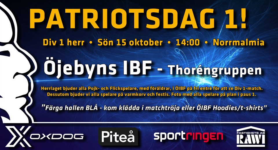 PATRIOTSDAGEN NR 1 säsongen 2023-2024 Nu på söndag 15 oktober så vill Herrlaget att alla våra Flick- och Pojkspelare från RÖD 1 till GRÖN 4 kommer till match i Norrmalmia • Öjebyns IBF - Thoréngruppen • Div 1 herr • Sön 15 oktober • 14:00 (var där redan 13:30 för att se del av uppvärmningen) Herrlaget bjuder alla flick- och pojkspelare, ledare och föräldrar i ÖIBF på gratis entré till matchen för att se en, på pappret, mycket och fartfylld spännande match. Dessutom bjuder vi alla spelare på varmkorv och festis. Foto med alla spelare på plan i paus 1. Möjlighet till Autografskrivning med våra A-lagsspelare. ”Färga hallen BLÅ - kom klädda i matchtröja eller ÖIBF Hoodies/t-shirts” LEDARE: Ta upp en lista på ungefär hur många spelare från ert lag som kommer, för att Herrsektionen ska kunna beställa varmkorv och festis och mejla sedan in antalet inkl ledare till ÖIBF-mejlen Välkomna hälsar Herrarna som hoppas på stöttning på läktaren.