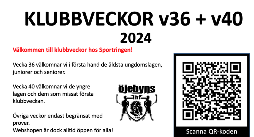 Denna andra klubbvecka pågår mellan fredag 4 oktober till onsdag 9 oktober och "provning av storlekar" gäller när Sportringen i Piteå har sina öppettider för att pröva ut kläder på plats. Information om Klubbveckorna i PDF Klubbveckan är till för ÖIBFs medlemmar, för att kunna prova ut och beställa föreningstextiler till rabatterade priser. Medlemmarna ges även förmånen att handla övriga produkter i butiken till 20% rabatt under hela veckan. (Erbjudandet gäller ej på cyklar, hockeyutrustning, REA-/ kampanjvaror och kan ej kombineras med andra erbjudanden.) Beställningar av textiler som avviker från klubbens profil görs lagvis efter föreningens godkännande och direkt till Sportringens klubbavdelning. FÖRENINGSPROFILEN Spelarnas kläder • Blå träningstischa, Oxdog Atlanta • Svarta träningsshorts, Oxdog Avalon • Svarta strumpor, Oxdog Fit Sock • Blå långärmad hoodie, Oxdog Glow Hood • Svarta träningsoverallbyxor, Oxdog Speed Pant Paket finns för: • 1 st. T-shirt och 1 par shorts • 2 st. T-shirts och 1 par shorts Ledarnas kläder • Svart ledarpiké - varje ledare som inte har fått tidigare erhåller en gratis skicka mejl till info@oibf.net - Oxdog Oxford • Svart långärmad hoodie, köpes själv Oxdog X-Hood • Svarta träningsoverallbyxor, köpes själv Oxdog Speed Pant EXTRA KLÄDER/UTRUSTNING Extra kläder/utrustning, som förstås är fritt att beställa extra också för spelare och ledare • Mörkblå Vinterjacka, Oxdog Fenix - padded jacket • Blå långärmad träningsoveralltröja, Oxdog Speed Jacket • Svart ryggsäck, Oxdog Ox1 Stick Backpack • Mörkblå keps, Oxdog X Flat Cap • Svarta Beachsandaler/Slippers, Oxdog Offcourt Slip Sandal • Svart vattenflaska 0,75L, Oxdog K2 Bottle UTPROVNING AV KLÄDER Utprovning av kläder kan göras under hela Klubbvecka 2, 4/10- 9/10 under deras ordinarie öppettider: • Vardagar 07-18 • Lördag 10-15 • Söndag 12-16 Då gäller även 20% för medlemmar i hela Sportringen Piteås butik BESTÄLLNINGAR För att beställa och se alla erbjudanden scanna in QR koden eller besök Sportringens Webbsida för Öjebyns IBF online Betalning sker via Klarna på hemsidan. Produkterna finns att hämta i butiken när ni fått ett meddelande att det är färdigt. Normal leveranstid är 2-4 veckor från det att beställningarna är skickade. Avvikelser i leveransen kan ske utifrån leverantörernas aktuella lagerstatus eller vid avvikande önskemål gällande trycken. KONTAKT Vid frågor kontakta oss på: Facebook eller via E-post till Öjebyns IBF Sportringens Mejl ÖVRIGT • Vecka 36 (2/9 – 8/9) välkomnar vi i första hand de äldsta ungdomslagen, juniorer och seniorer. • Vecka 40-41 (4/10 - 9/10) välkomnar vi de yngre lagen och dem som missat första klubbveckan. Övriga veckor endast begränsat med prover. Webshopen är dock alltid öppen, för alla! Välkomna till den nya säsongen hälsar // Styrelsen och sektionerna.