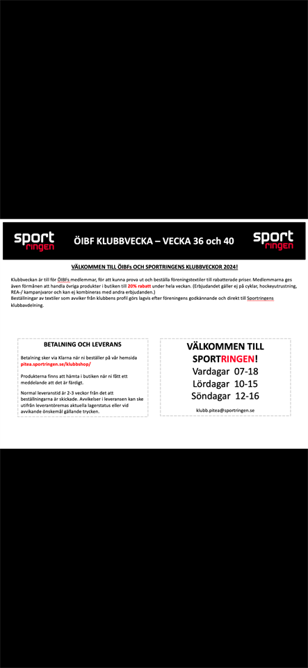 Nu vecka 40 är det klubbvecka på sportringen. Där har vi möjlighet att prova ut träningskläder under butikens öppettider. Beställningen görs sedan via sportringen piteås hemsida. Klicka er vidare till klubbshop och välj öjebyns innebandyförening. Vi får även 20% rabatt i butiken på övriga varor. Vill även tillägga att det inte är något måste på att använda dessa kläder. Det är högst frivilligt! Matchkläder (shorts och T-shirt) delas ut vid sammandrag. F-2016 30 sep 2024 0kommentarer