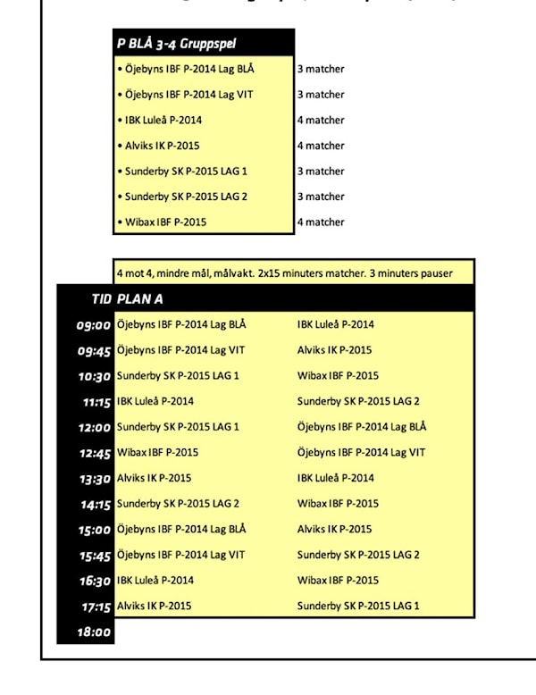 Första match startar 09.00, var på plats ca 08.30 för att ställa iordning utrustningen och se så det fungerar.