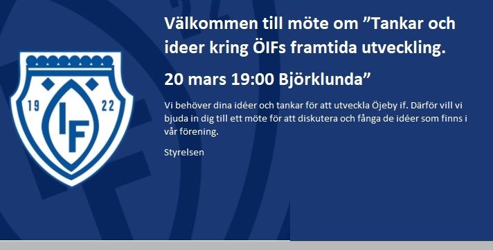 20 mars 19:00 Björklunda” Vi behöver dina idéer och tankar för att utveckla Öjeby if. Därför vill vi bjuda in dig till ett möte för att diskutera och fånga de idéer som finns i vår förening. Styrelsen F-13 16 feb 2023 0kommentarer