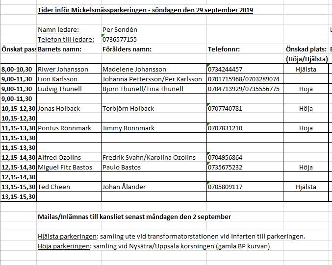 Hej, här kommer parkeringsvaktsschemat för Mickelsmäss. Vill ni byta tid så gör det i första hand sinsemellan och meddela gärna kansliet så att de vet vilka som ska stå. Det finns även outnyttjade tider i listan. Vill man ha en av dessa så hänvisar vi till kansliet, detsamma gäller om man har särskilda önskemål gällande plats som man ska stå på. (kansli@orsundsbroif.se) /Fotbollstränarna P-10 Fotboll 29 aug 2019 0kommentarer