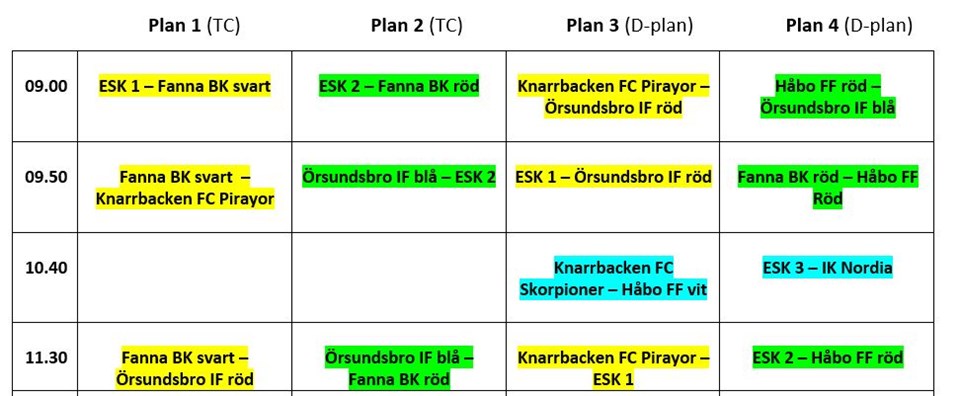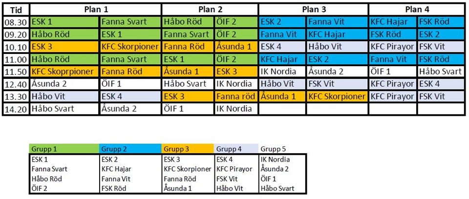 Hej! Grabbarna spelade bra i söndags, roligt att se! Inför söndagens poolspel så ser vi gärna att de som har målvaktshandskar tar med de eftersom vi inte ännu har några som ingår i matchställsuppsättningen. På söndag ställer vi upp med två lag och vi har blivit uppdelade i en förmiddags- och en eftermiddagsgrupp. Detta innebär att vi kommer att ha två samlingar nere på Åvallen. Förmiddagsgruppen samlas kl 7:15 och eftermiddagsgruppen samlas 10:30. Så har ser lagen ut: ÖIF 2 (samling 7:15) Arvid, Thor, Scott, Pontus, Alfred, Ludvig, Miguel och Jonas. ÖIF 1 (samling 10:30) Walter, Elias, Emil, Lion och Riwer. Här kommer laget även att förstärkas med Arvid W och Lukas från P11. Vi kommer att spela på Gröna dalens IP i Bålsta: https://goo.gl/maps/9LpXPo3oYUo Som vanligt kommer det att finnas kiosk. Där säljs hamburgare, kaffe mm. Vi ses på söndag! /Fotbollstränarna
