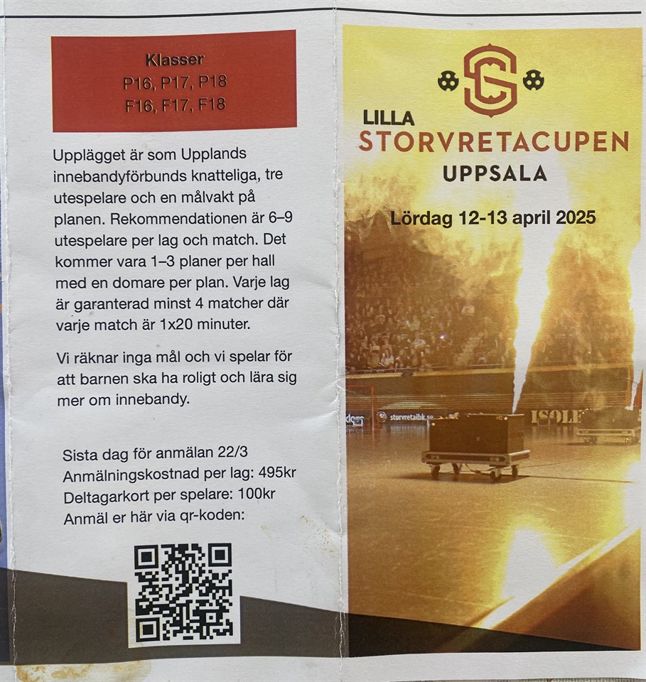 Hej! Vi har fått en inbjudan till ”Lilla Storvreta cupen” Lördagen den 12 april så jag tänkte kolla om det fanns något intresse för det? Det utlovas minst 4 (1x20 min) matcher och varmkorv med Festis! Kostnaden är 495kr per lag så det landar väl på 40-50kr per spelare. Det står inget om några tider men jag misstänker att det kommer spänna över ett längre tidsspann än vad poolspelen gör plus att det kanske är hallbyten osv. Vi bör vara minst 3 ledare och gärna någon reserv utifall sjukdom t.ex Det kan ju vara en kul avslutning på årets säsong, vad tycker ni? Obs! Skickar ut en kallelse för att se om intresset finns, slutgiltig anmälan kommer om/när vi faktiskt är anmälda till cupen. https://lillastorvretacupen.cups.nu