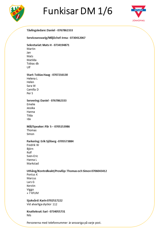 Söker efter personer som kan tänkas sig att hjälpa till i serveringen eller på parkeringen! Parkeringen är begränsat arbete mellan 9.30 till 12. Här kommer en lista på arbetsuppgifter nu på lördag. Vi ses klockan 8 på badet. Använd de officiella parkeringarna dvs de som deltagarna använder sig av. Parkera ordentligt då ni är först på plats. I serveringen bjuds det på lunch, dricka och kaffe. Om någon saknar sitt namn på listan eller vil hjälpa till får ni skriva nedanför!