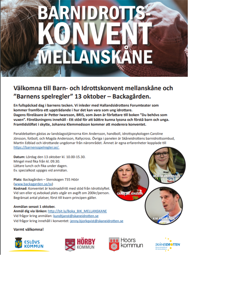 Lördagen 13 oktober annordnas ett barnidrottskonvent i mellanskåne. Är där något barn med förälder som är intresserade av att delta i detta så skicka ett mail till onnekopsif@gmail.com senast 1 oktober så anmäler vi er till det. Buss från Hörby till Backagården ingår, men först till kvarn gäller. Allt är kostnadsfritt.