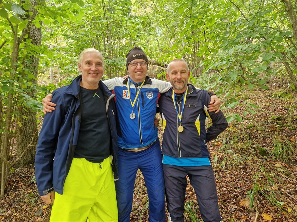 BILD: Medaljörerna i H50 Carl-Erik Sjöberg & Peteris Kursitis tillsammans med den legendariska Knut Johansson Under förra helgen, 17-18 seprember, avgjordes SM i Lång- respektive Medeldistans på hemmaplanen där vi i samarbete med orienteringsklubbarna Söders-Tyresö OL & Mälarö SOK samt Bromma-Vällingby SOK arrangerade mästerskapen. Totalt anmälde sig 10 orienterare till dessa två dagar i SM-klasserna samtidigt som ett antal deltagare från nybörjarkursen och utanför skulle delta i de öppna banor som fanns, de officiella SM-klasserna var H21 och H50 som hade 4 anmälda i respektive klasser medan D21 tyvärr återigen blev en inofficiell klass med endast två anmälda. Från Hephatas håll anmälde sig Josefin Häggdahl (D21), Frej Fredman (H21), Peteris Kursitis, Jonas Berglund samt Ove Wallster (H50). Dock tvingades de två sistnämnda lämna återbud på grund av skador dagarna intill mästerskapet! Även i H21 tvingades Nerikeduon, Jesper Melin och Rihards Darzins lämna återbud på grund av sjukdomar alldeles intill mästerskapet vilket innebar att såväl H21 och H50 iställer för 4 endast hade 2 löpare på startfältet. Även om det var tråkigt med återbud så nära inpå bäddade det för spännande dueller i båda klasserna där Frej i H21 skulle fajtas mot SK Lundias Henrik Eklund och Peteris skulle ställas mot den legendariska Dövorienteraren Carl-Erik Sjöberg från IK Virtus. Även Josefin tilltänkta motståndaren lämnade återbud bara dagar innan vilket innebar att Josefin istället fick tävla mot sig själv och se tävlingarna som nyttiga träningspass inför framtida tävlingar. Första dagen av, lördagen den 17:e, mästerskapet bestod av långdistansen i samband med tävlingen Brakmarslången som genomfördes i vackra Tyresta Naturreservat som stundtals erbjöd tuff kupering. I H21 klassen avbröt både Frej och Henrik där undertecknat hade det svårt med 15 000 skalan och stod för flera tekniska missar medan den sistnämnda inte riktigt orkade med den tuffa terrängen. Det innebar att ingen medalj delades ut i långdistansen detta år! I H50 klassen hade såväl Peteris som Carl-Erik det tufft, båda vittnade att det var fysiskt krävande och tekniskt svårt men till slut var det den förstnämnda, vår alldeles egen Peteris som var snäppet vassare och vann med ca. 10 minuter tillgodo! Under prisutdelningen dök en mycket stor Hephataprofil inom orienteringen, nämligen Knut Johansson som anses vara en av Svensk Dövorienterings allra bästa genom tiderna och delade ut medaljerna vilket uppskattades enormt av alla! Josefin krigade på genom hela loppet, även hon upplevde att det var riktigt tufft och stod för ett par missar men kom in godkänt. Vinnaren i D21 klassen (den befintliga tävlingen) var ingen mindre än Helena Bergman som vunnit otaliga SM medaljer för hörande och är en av Svensk Orienterings allra främsta. RESULTAT DSM LÅNG H50 - 5720 m 1. Peteris Kursitis, IK Hephata, 1:33.17 2. Carl-Erik Sjöberg, IK Virtus, 1:43.05 Ej start. Ove Wallster, IK Hephata Ej start. Jonas Berglund, IK Hephata Under söndagen förflyttade vi oss från östra till västra Stockholm när Medeldistansen skulle genomföras i vackra Ekerö, den alldeles nyritade kartan skulle erbjuda löparna tekniska utmaningar i ett stigfattigt område men relativt lättlöpt och öppna bergshällar.Vädret var verkligen på vår sida denna dag, solen sken och temperaturen låg behagligt på runt 16-18 grader. I H21 klassen ville såväl Frej som Henrik revanschera för avbrutna lopp under dagen innan och vi fick uppleva en jämn fight. Henrik inledde bäst efter två mindre missar av Frej och ledde med 1:30 min vid kontroll 5, men därefter var det istället Henriks tur att göra dubbla mindre missar och Frej ledde med ett par minuter innan båda två stod för rejäla missar vid kontroll 9. Därefter började avståndet växa och Frej höll sig undan trots ett par ytterligare missar under loppet och kunde vinna med 7:33 minuter tillgodo till Henrik som krigade rejält på slutet trots krafterna börjat ta slut. RESULTAT DSM MEDEL H21 - 5640 m 1. Frej Fredman, IK Hephata, 57:57 2. Henrik Eklund, SK Lundia, 1.05:30 Ej start. Rihards Darzins, IF Nerike Ej start. Jesper Melin, IF Nerike Sen var det dags för H50 klassen, skulle Carl-Erik Sjöberg kunna revanschera Peteris? Nej, Peteris var en klass för sig själv idag och stod för ett mycket stabilt lopp med minimala missar och kom i målet med finfina 36.13 vilket var hela 19.48 minuter före Carl-Erik som återigen fick se sig besegrad. Carl-Erik stod för en mycket stor miss vid 3:e kontrollen där han samlade på sig hela 16 minuter för att jämföra med Peteris som hade 3.50, utan missen på denna kontroll hade det varit betydligt jämnare! Peteris får således titulera sig som kungen av denna mästerskapshelg med dubbla SM-guld! RESULTAT DSM MEDEL H50 - 3550 m 1. Peteris Kursitis, IK Hephata, 36.13 2. Carl-Erik Sjöberg, IK Virtus, 56.01 Ej start. Ove Wallster, IK Hephata Ej start. Jonas Berglund, IK Hephata Josefin sprang återigen själv, stod för ett stabilt lopp med två lite större missar men i överlag ett mycket fint lopp där hon kom in i mål på 46.52 i D21-klassen som återigen vanns av Helena Bergman. Utöver deltagarna som anmält sig till SM deltog flera Hephatister, som deltagit i nybörjarkursen ett par helger tidigare, i de öppna klasserna som skulle funka som ett slags slutprov. Och som de levererade! Från att knappt ha hållit i en karta för två veckor sen till att samtliga deltagare klarade banorna med godkänt! Ett extra beröm till Magnus Nordström som under lördagen fick godkänt på Öppen Klass - lätt och direkt chansade på Öppen Klass - Medelsvår under söndagen där det återigen blev ett nytt godkänt lopp! Riktigt roligt att se samtliga nybörjare förstå grunderna i orienteringen och nu klarar av att orientera i skogen, förhoppningsvis blir det en motionsform so
