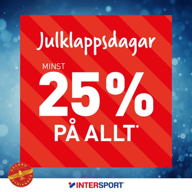 Missa inte julklappsdagar hos vår samarbetspartner Intersport 11–15 december. Passa på att handla sport och sportmode från välkända varumärken - Just nu med minst 25% rabatt på allt. Ge bort sport i jul! Välkommen till din närmsta Intersportbutik eller intersport.se! *Erbjudandet gäller 11–15 december på ord.pris, dock ej på cykel, presentkort, elektronik, föreningskläder/teamkläder eller beställningsvaror.