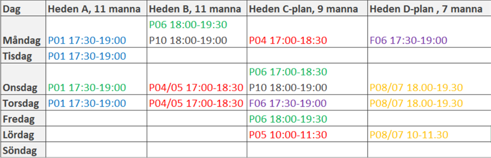 Hej, i bifogad fil hittar ni de uppdaterade träningstider som tränarguppen kom överens om 2017-04-05. Ni som ska hålla i träningen behöver höra av er till Ercan, för att kvittera ut en nyckel om ni inte redan har en. Träningarna kan börja Utomhus när gräsplaner har torkat. OBS! När ni slutar träna inomhus är det viktigt att ni meddelar Ercan, så att vi kan avboka kvarstående trängstider inomhus. Med vänlig hälsning /styrelsen