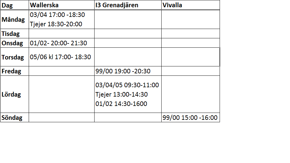 Hej! Kommunen har beslutat att Varbergahallen inte längre ska nyttjas för inomhusträningar. Tyvärr kommer inte Mikaelskolan bli tillgänglig före april. Dessa förutsättningar har tvingat oss att hitta nya lösningar för att hålla träningar inomhus. Se tider för respektive lag genom att klicka på bilden till höger. /Afrem C