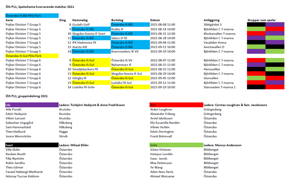Se bifogad fil, nu kan ni börja planera inför höstens matcher! Inspirerat av andra lag i ÖIS har vi för matchernas skull delat in pojkarna i färggrupper baserat på ålder, trygghet och fotbollsutveckling. Pojkarna kommer alltid tillhöra sin färggrupp vid match men alla grupper kommer att få spela med varandra. På träning är vi alla samlade i vanlig ordning. Nu kan ni lättare planera andra aktiviteter än fotboll:-) /Ledarna P11 20 jun 2021 1kommentar