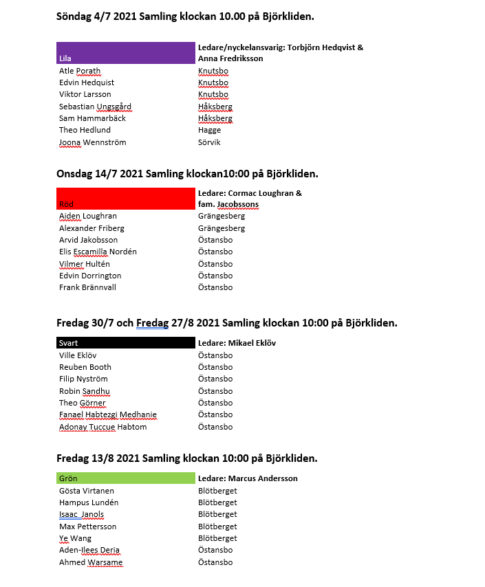 Hej! Följande gäller: Vi har FEM tillfällen under sommaren som vi i P-11 ska sköta vattningen av planerna på Björkliden. Grupperna enligt mail som gått ut till förälder kopplad till barnet på laget.se gäller och är då ansvariga för att det blir gjort. Lägg in tilldelat datum i kalender omgående. Tränaren/ledarna för varje färggrupp är nyckelansvarig. Nyckel hämtas hos Tobbe. Man träffas sin dag på Björkliden kl 10:00 för fördelning av hur vattningen ska skötas under dagen. Kan man inte får man byta med någon i annan grupp, men det får man sköta själv. En grupp har fått två tillfällen och det blev Östansbo gruppen med tanke på närheten till Björkliden. Ha en skön sommar! OBS! Bifogat foto har dålig upplösning, kolla schemat i mailet istället då. P11 30 jun 2021 0kommentarer