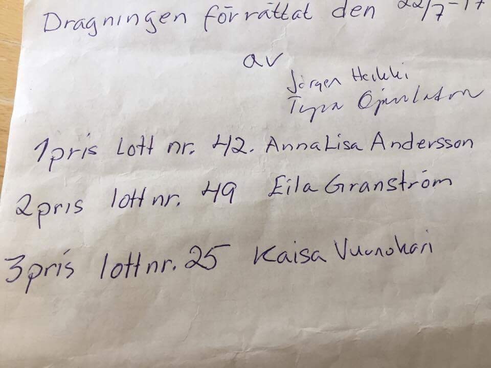 Lördag 22/7 hade vi dragning av vårens tavellotteri. 1:a pris - Lott nr 42, Anna-Lisa Andersson 2:a pris - Lott nr 49, Eila Granström 3:e pris - Lott nr 25, Kaisa Vounokari Tack till alla som köpt lotter och stort grattis till vinnarna!