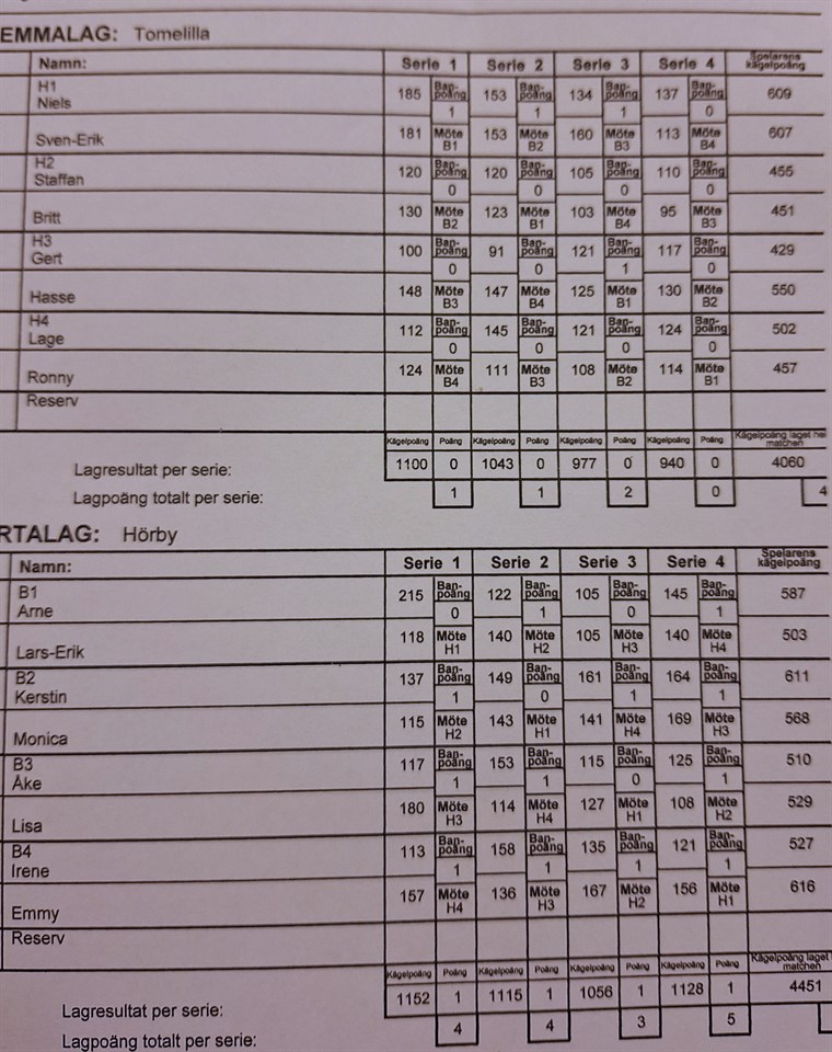 Vänskapsmatchen Tollarp - Hörby slutade med Hörbyseger med 9-11 (4354-4391). Kerstin Almqvist med 653 p och Arne Almqvist 644 p toppade Hörbylaget följt av Göran Andersson 604 p. hela resultatrapporten hittar du här