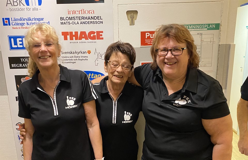 PBK Hörby 2 som matchade i Tollarp tog ledningen direkt i första med 1-4 och fortsatte med 1-4 och 1- 4 igen och så var segern i hamn. Tollarp tog sista med 3-2 så matchen slutade med 6-14 (4906-5067). Därmed leder Hörby 2 fortfarande serien. De tre damerna på bilden bidrog starkt till segern där Anna-Lena gjorde 693 p, Eva 648 p och Irene 747 p. PBK Hörby 3 spelade mot Cefyra P2 i Åhus. Första serien var dagens svagaste av båda lagen men Hörby tog iallafall ledningen med 2-3. I andra ryckte Cefyra och vann den med 4-1. Hörby svarade med 0-4 och så stod det 6-8. Hörby kämpade på och vann också sista seren till slutresultatet 8-11 (4383-4400). Marie-Louise 592 p, Emmy 591 p och på tredje plats kom Sven H 578.