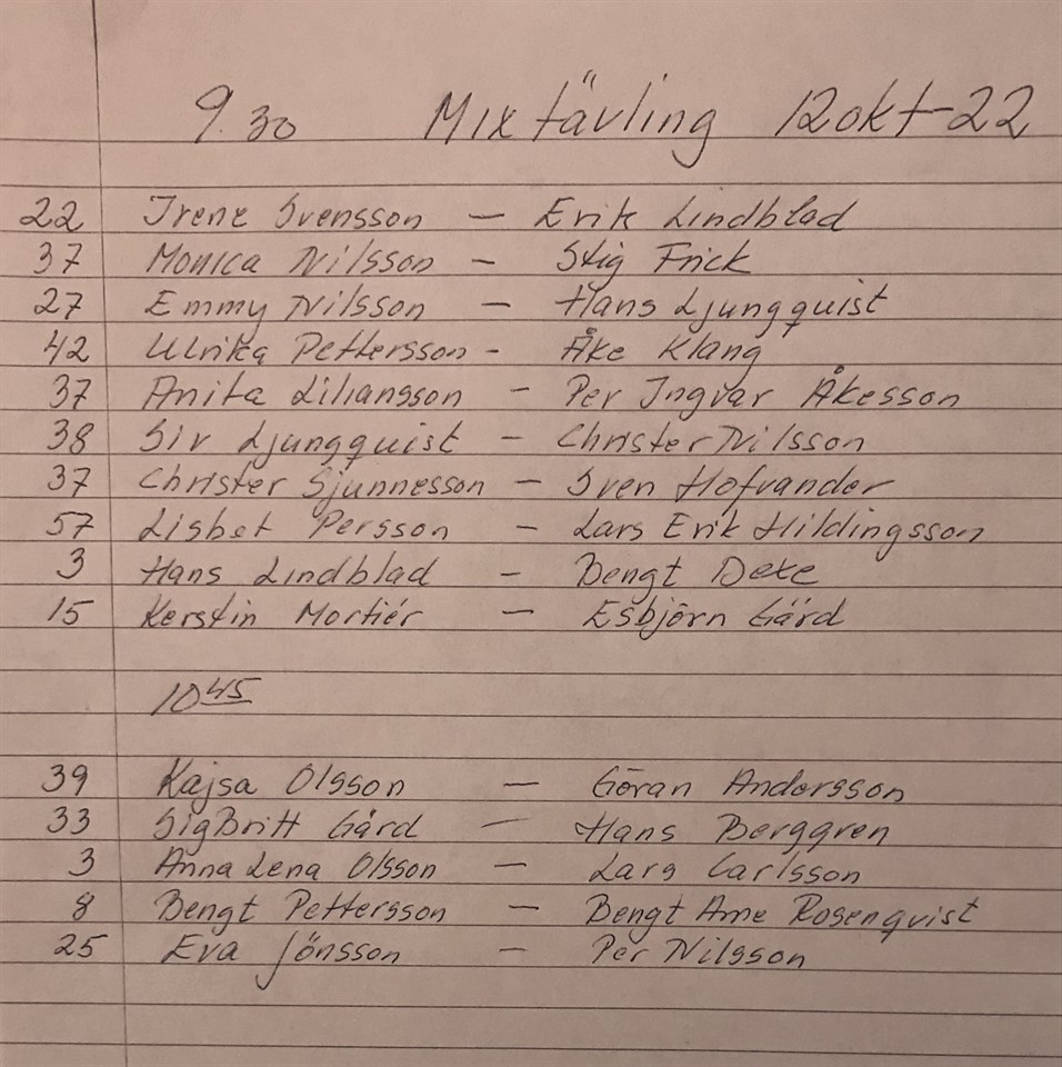 Helt outstanding var Hans Lindblad med 850 p på sina 4 serier i segermatchen mot Knislinge PB 1. PBK Hörby 1 tog en utklassningsseger med 20-0, inte ofta det blir sådana siffror, med slagpoängen 5479-4577. Som alla förstår så var den enda spänningen om vi skulle tappa en poäng eller inte men det var övertygande spel från början till slut. Över 700 tog sig också Bengt-Arne Rosenqvist med 726 p och Esbjörn Gärd med 715 p. Hörby 2 spelade mot BK 80 Hässleholm i Hässleholm och tog ledningen med 4-1 i första men sen kvitterade hemmalaget till 5-5 efter att ha gjort över 1300 p i andra. Hörby gjorde över 1200 p i både tredje och fjärde serierna och vann båda med 4-1 till slutseger med 13-7 medan hemmalaget hade bästa slagpoängen med 4844 mot Hörbys 4840. Individuellt var det Per Nilsson med 650 p som blev bäst följd av Rune Olsson 641 p och Emmy Nilsson 614 p. Även Hörby 3 hade match i Hässleholm mot deras fjärdelag. Efter 4-1 och 5-5 tog hemmalaget kommandot med ännu en 4-1 serie och till sist 3-2 och därmed 12-8 i slutresultat och 4416-4369 i slagpoäng. Topptrion blev Stig Frick 639 p, Jan-Erik Persson 572 p och debutanten Sven Hofvander 570 p. Morgondagens laguttagning kommer inte publiceras på hemsidan förrän på lördag men finns som vanligt i hallen på anslagstavlan imorgon eftermiddag.