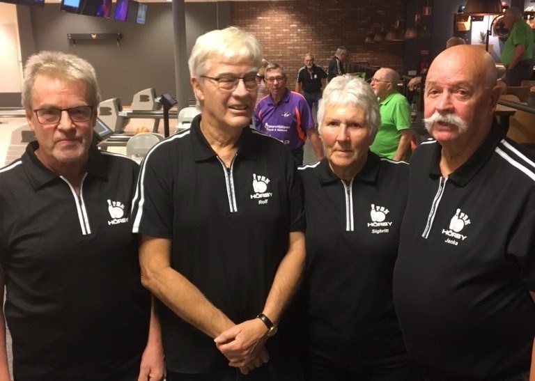 Även om Markaryd lag 3 fick ses som favoriter så var det Hörby 2 som tog tag i taktpinnen redan från början. Hörby startade med 4-1 och 1147 i slagpoäng. Hörby fortsatte på den inslagna vägen och tog 4-1 igen I tredje blev det bara 3-2 för att sedan avsluta med 4-1 igen. Hörby ökade i alla serierna och fick ihop 4862 mot Markaryds 4534 p. Mycket bra Hörby 2. På bilden ser vi Christer Nilsson 636 p, Rolf Persson 669 p, Sigbritt Gärd 621 p och Jan-Ingvar Persson 622 p.