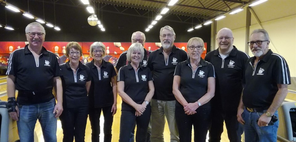 PBK Hörby 1 tog emot serieledarna PBK Olofström 1. Olofström hade 5 segrar innan matchen i Hörby och skulle väl bara stanna till och hämta poängen med sig hem. Olofström tog också ledningen efter dåligt spel av Hörby och första serien slutade 1-3. Gästerna plockade även hem andra serien och det med 2-3. Sen fick Hörby till en kanonrunda på 1475 p och därmed 5-0. Jag har nog aldrig hört både spelare och publik så mycket som idag och det var verkligen fajting. Hörby tog de de två poängen som behövdes i sista serien och vann matchen med 10-9 (5346-5400). Coachen var inte riktigt nöjd trots segern för vi vann bara en av fyra serier i totalen. Göte Nilsson 808 p, Bengt Dexe 766 p, Bengt-Arne Rosenqvist 698 p och Kerstin Mortiér 683 p. På biden det segrande laget.
