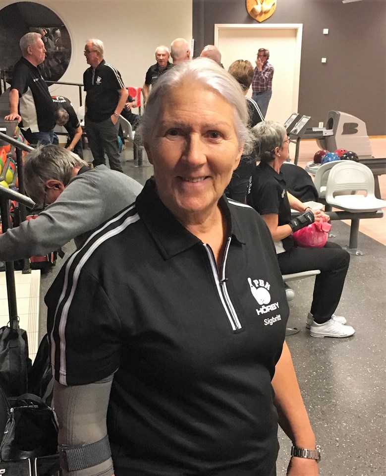 Underläge efter första med 2-3 efter dagens sämsta serie (1120 p). Ökning med 100 poäng i de övriga tre serierna gjorde att vi till slut vann med 12-8 (4814-4504) och detta var vår första seger. Segern innabar förstås att vi nu lämnade bottenskiktet och kan sträva vidare uppåt. Tre damer i topp med Sigbritt Gärd (bilden) etta på 627 p, Emmy Nilsson 612 p och Gunilla Huszar 611 p