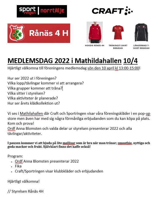 MEDLEMSDAG 2022 i Mathildahallen 10/4 Hjärtligt välkomna till föreningens medlemsdag sön den 10 april kl 13:00-15:00! Hur ser 2022 ut i föreningen? Vilka lopp/tävlingar kommer vi att arrangera? Vilka grupper kommer att träna? Vilka sitter i styrelsen? Vilka aktiviteter är planerade? Hur ser årets klädkollektion ut? Vi ses i Mathilahallen där Craft och Sportringen visar våra föreningskläder i en pop-up store men även har med sig några förmånliga erbjudanden som du kan köpa på plats. Kom och prova! Ordf Anna Blomsten och valda delar ur styrelsen presenterar 2022 och alla tävlingar/aktiviteter. I pausen kommer vi att bjuda på lite mellisar som är bra när man tränar; smoothie, nyttiga och goda mackor och frukt. Självklart finns det kaffe också! Program: • Ordf Anna Blomsten presenterar 2022 • Fika • Craft/Sportringen visar klubbkläder och erbjudanden Hjärtligt välkomna! // Styrelsen Rånäs 4H