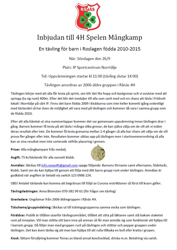 Äntligen ges det chans att tävla i friidrott för de yngre barnen födda (2015-2010*) När: Söndagen den 26/9 Plats: IP Sportcentrum Norrtälje Tid: kl 11-14 (uppvärmningen börjar kl 11) Grenar: Mångkamp (hopp,kast och löpgrenar) MEDALJER till alla MÅNGKAMPARE efter avslutad tävling. Anmälan: Skickas till info.ranas4h@gmail.com uppge följande: Barnens förnamn samt efternamn, födelseår, klubb. Samt om du kan hjälpa till genom att följa med ditt barns grupp runt under tävlingen. Anmälan är godkänd när avgiften är betald via switch 123 0986 224 (Barnen namn i kommentaren via switch). Mer info se inbjudan i bilden, samt att varje träningsgrupp kommer få möjlighet att dela ut inbjudningar under veckans träningar. Länk till inbjudan Tävlingen kommer vara öppen för alla friidrottsklubbar i Roslagen (Estuna, LK Roslagen, Roslagbro och Rånäs 4H) Om det finns platser kvar så kan vi öppna upp för andra utomstående klubbar, men antalet platser kommer vara begränsat så försten till kvarn gäller. Har man anmält och betalt så har man en plats i mångkampen :-) Hoppas vi ses på IP den 26/9 :-) *2009 som inte kommit iång med tävlande har också möjlihget att få vara med.