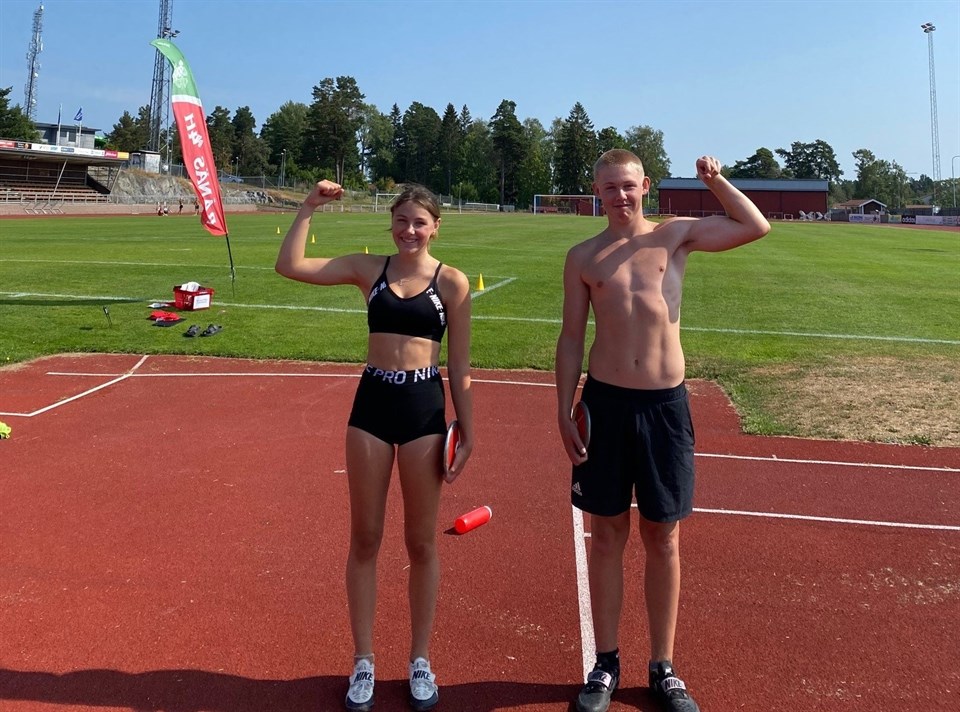 På ett hett IP så körde vi idag ytterligare en veckans grenar tävling, denna gång diskus och höjd. Många är bortresta denna vecka så det blev ett lågt deltagande denna gång. Men resultaten var ändå väldigt fina trots blåsten på IP. I diskus så slog Bo till med fina 37.07m, pers med hela 5m. Vilket göra att Bo klättar upp ytterligare i Sverielistorna till en fin 15plats. Vi vet också att längre kast finns för på uppvärmningen så slog han till med fina 37.67m, utanför tävlan så klart men ändå ett bevis på att längre kast finns. Emilia kastade också jätte fint idag, även hon slog till med nytt pers 31.74, pers med nästan 1.5m. Vilket gör att hon nu intar 7:e platsen på Sverigelistan för F16. Extra kul är att se de aktiva både peppa varandra och ge varandra tips i kastningen. I höjd blev det nästpers för både Lovisa och Emilia, vilket betyder att de hoppade sitt näst högsta :-) Vinden ställde till det lite på höjden, men mest var det nog att när man börjar tycka att det är högt så kan ibland hoppningen låsa sig fast man hoppat högt över höjden innan. Resultat