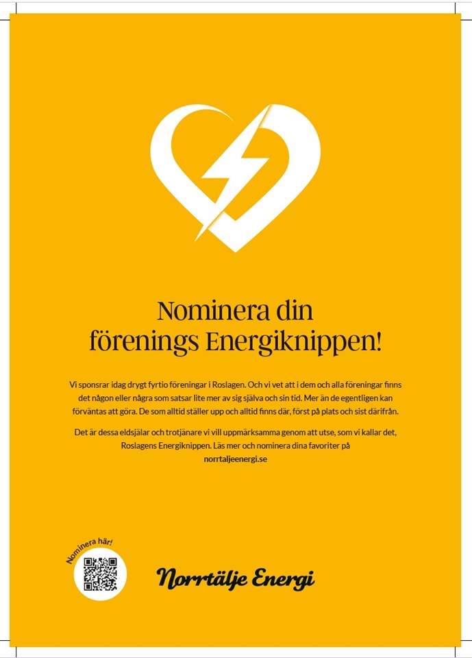 Nominera föreningens energiknippen till Norrtälje Energi, läs mer nedan. Norrtälje Energi. Vi sponsrar idag drygt fyrtio föreningar i Roslagen. Och vi vet att i dem och alla föreningar finns det någon eller några som satsar lite mer av sig själva och sin tid. Mer än de egentligen kan förväntas att göra. De som alltid ställer upp och alltid finns där, först på plats och sist därifrån. Det är dessa eldsjälar och trotjänare vi vill uppmärksamma genom att utse, som vi kallar det, Roslagens Energiknippen. Läs mer och nominera dina favoriter på norrtaljeenergi.se https://energiknippen.se/