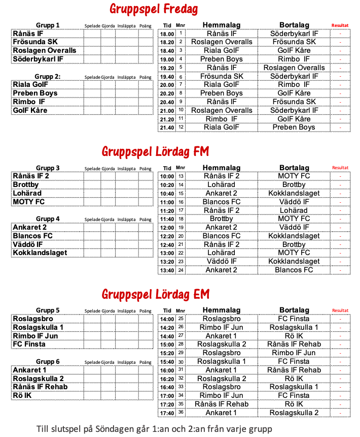 Sent om sider så ligger här ett ett Spelschema för Rånäscupen 2023 Matcher och Tabell ligger även under fliken Serier här på sidan OBS dom vakanser som det förut har meddelats om har blivit tillsatta, vi tackar spelare och ledare som på kort varsel ställer upp och ser till så att vi slipper ändra om i tidschemat! RånäsCupen 6 jan 2023 0kommentarer