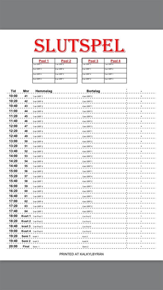Här på bilden visar vi hur söndagens slutspel ser ut med tider och så vidare. Fyra lag ut varje grupp kommer att gå vidare till söndagens slutspel. RånäsCupen 29 dec 2014 0kommentarer