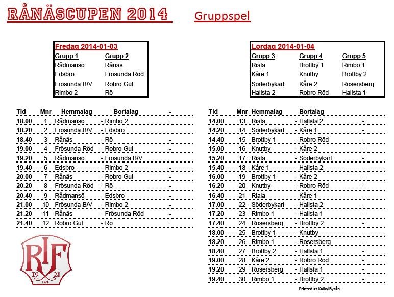Så här ser Grupperna ut Till slutspel på Söndagen går 1:an och 2:an från varje grupp samt bästa 3:an på fredagen och bästa 3:an på lördagen Väl mött RånäsCupen 18 dec 2013 0kommentarer
