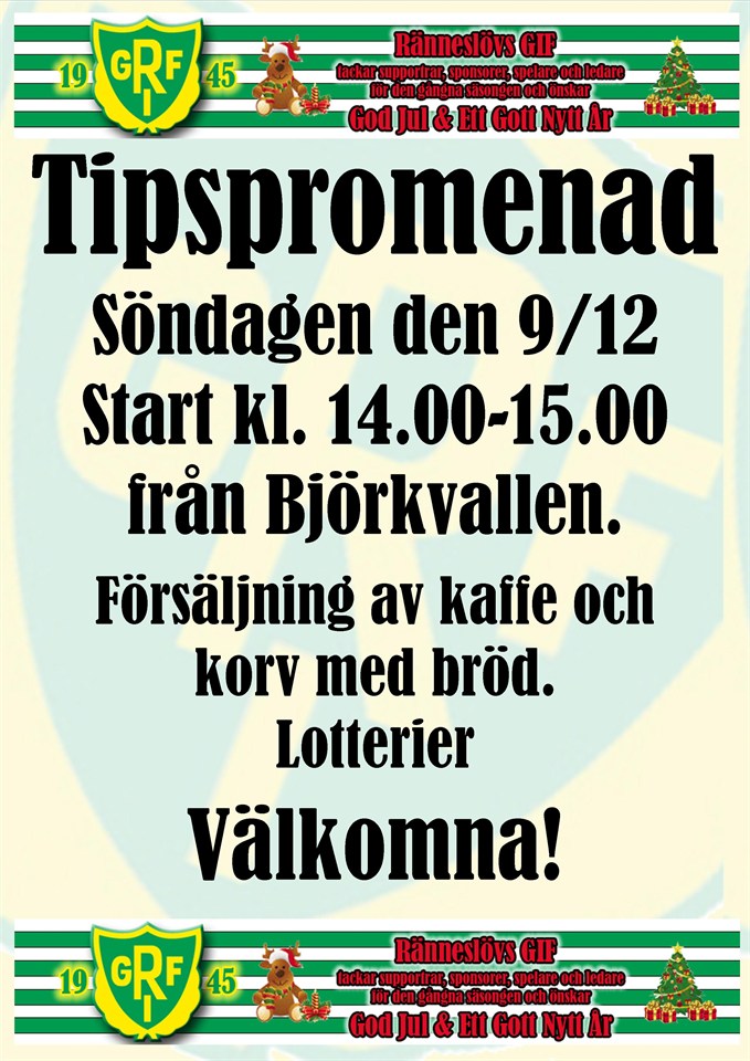 Välkomna till Tipspromenad söndagen den 9/12. Start kl. 14.00-15.00 från Björkvallen. Försäljning av kaffe och korv med bröd. Lotterier Välkomna!