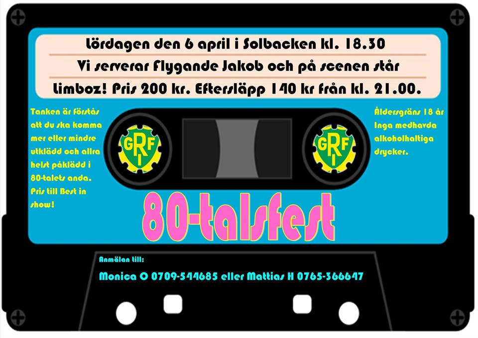 Lördagen den 6 april kl. 18.30 är det 80-talsfest i Solbacken, Edenberga. Vi serverar en klassisk 80-talsrätt, Flygande Jakob, och på scenen underhåller Limboz! Pris 200 kr. Eftersläpp 140 kr efter kl. 21.00. Åldersgräns 18 år. Anmälan till: Monica Ottosson, 0709-544685 Mattias Hultin, 0765-366647 Välkomna!
