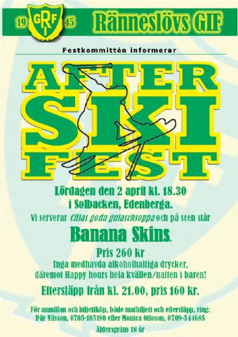 Lördagen den 2 april kl. 18.30 i Solbacken, Edenberga. Vi serverar Cillas goda gulaschsoppa och på scen står Banana Skins. Pris 260 kr Inga medhavda alkoholhaltiga drycker, däremot Happy hours hela kvällen/natten i baren! Eftersläpp från kl. 21.00, pris 160 kr. För anmälan och biljettköp, både matbiljett och eftersläpp, ring: Pär Nilsson, 0705-185180 eller Monica Ottoson, 0709-544685 Åldersgräns 18 år.