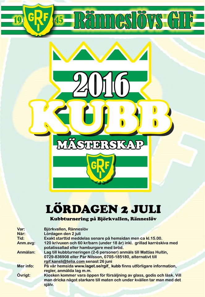 Lördagen den 2 juli 2016 är det kubbturnering på Björkvallen i Ränneslöv. Anmäl ett lag (man behöver inte vara medlem i RGIF för att vara med i turneringen) med 2-6 personer, lagnamn och lagmedlemmar, senast den 26 juni till Mattias Hultin, 0729-836908 eller Pär Nilsson, 0705-185180 alternativt till rgif.kansli@telia.com. Vi delar in de anmälda lagen i grupper där alla möter alla, de bästa lagen i varje grupp går sedan vidare till slutspel. Hur många lag i varje grupp och hur många lag som går vidare bestämmer vi efter vi vet hur många lag som anmäler sig. Exakt vilken tid turneringen startar bestäms också när vi vet hur många lag vi blir men ungefär kl. 15.00 kommer det att dra igång. Det kostar 120 kr/vuxen och 60 kr/barn (under 18 år) att anmäla sig. I anmälningsavgiften ingår grillad karréskiva med potatissallad eller hamburgare med bröd. Kiosken kommer vara öppen för försäljning av glass, godis och läsk. Vill man dricka något starkare till maten och under kvällen tar man med det själv. Sammanfattning Var: Björvallen, Ränneslöv När: Lördagen den 2 juli Tid: Exakt starttid meddelas här på hemsidan senare men ca kl. 15.00. Anm.avg: 120 kr/vuxen och 50 kr/barn (under 18 år) inkl. mat. Anmälan: Lag till kubbturneringen anmäls till Mattias Hultin, 0729-836908 eller Pär Nilsson, 0705-185180 senast 26 juni