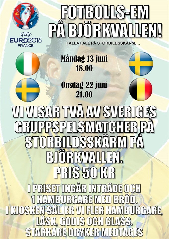 EM i fotboll börjar närma sig, den 13 juni spelar Sverige sin första match, detta mot Irland. Vi kommer ha visning av den matchen och den avslutande gruppspelsmatchen mot Belgien på storbildsskärm på Björkvallen. Vi kommer finnas på plats en timme innan matchstart den 13 juni och 1-2 timmar innan matchstart den 22 juni (mer exakt info om det senare). Välkomna!