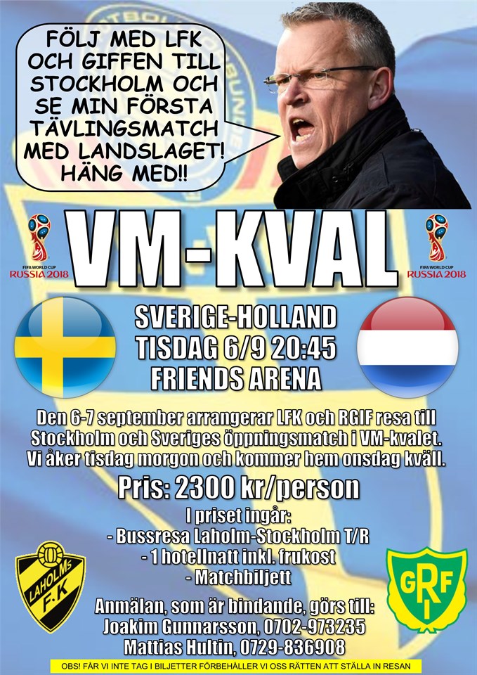 Fotbolls-EM börjar snart (vi visar för övrigt två av Sveriges matcher på storbild på Björkvallen) och senare i höst drar VM-kvalet igång med Janne Andersson som ny förbundskapten. Första matchen i kvalet är den 6 september på Friends Arena och till den matchen ordnar vi tillsammans med Laholms FK en fotbollsresa. Häng med!