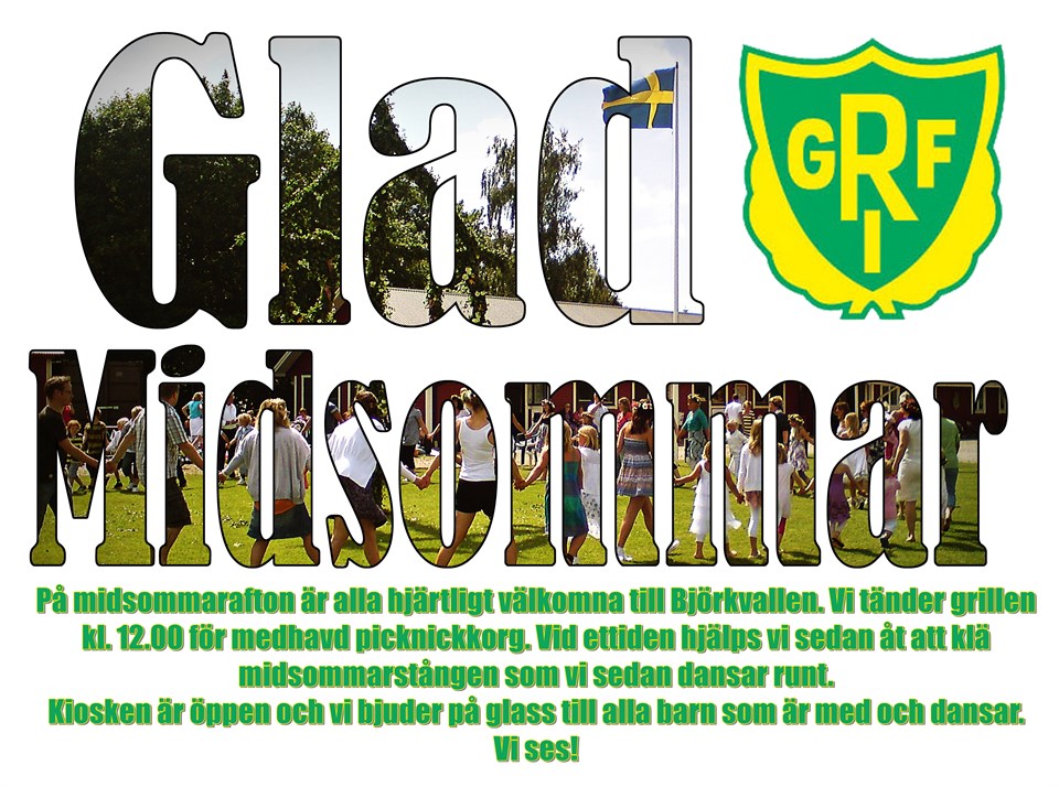 På midsommarafton är alla hjärtligt välkomna till Björkvallen. Vi tänder grillen kl. 12.00 för medhavd picknickkorg. Vid ettiden hjälps vi sedan åt att klä midsommarstången som vi sedan dansar runt. Kiosken är öppen och vi bjuder på glass till alla barn som är med och dansar. Vi ses!