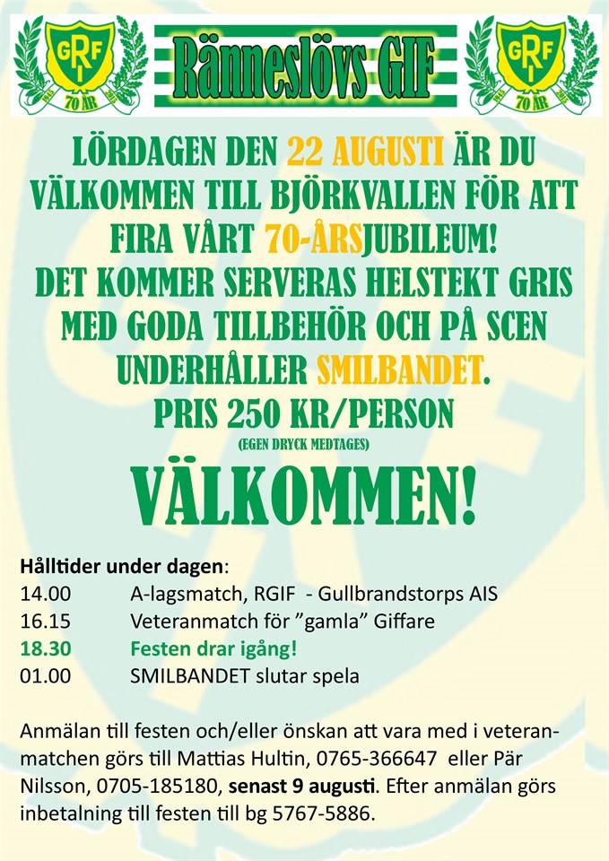 Lördagen den 22 augusti är Du välkommen till Björkvallen för att fira vårt 70-årsjubileum! Det kommer serveras helstekt gris med tillbehör och på scen underhåller SMILBANDET. Pris 250 kr/person (egen dryck medtages) Hålltider under dagen: 14.00, A-lagsmatch, RGIF - Gullbrandstorps AIS 16.15, Veteranmatch för ”gamla” Giffare 18.30, Festen drar igång! 01.00, SMILBANDET slutar spela Anmälan till festen och/eller önskan att vara med i veteranmatchen görs till Mattias Hultin, 0765-366647 eller Pär Nilsson, 0705-185180, senast 9 augusti. Efter anmälan görs inbetalning till festen till bg 5767-5886. Välkommen!