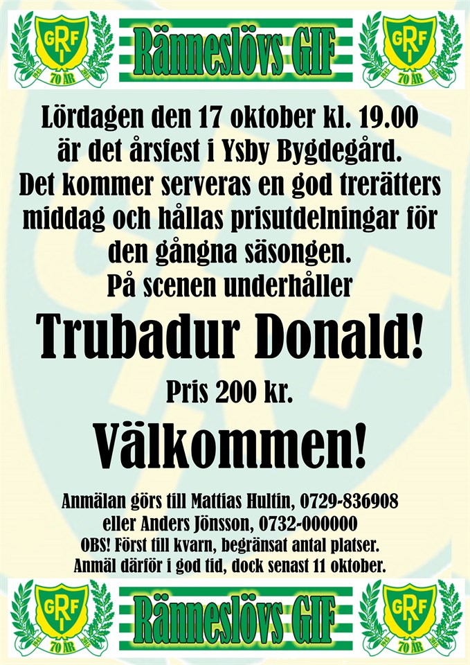 Lördagen den 17 oktober kl. 19.00 är det årsfest i Ysby Bygdegård. Det kommer serveras en god trerätters middag och hållas prisutdelningar för den gångna säsongen. På scenen underhåller Trubadur Donald! Pris 200 kr. Välkommen! Anmälan görs till Mattias Hultin, 0729-836908 eller Anders Jönsson, 0732-000000 OBS! Först till kvarn, begränsat antal platser. Anmäl därför i god tid, dock senast 11 oktober.