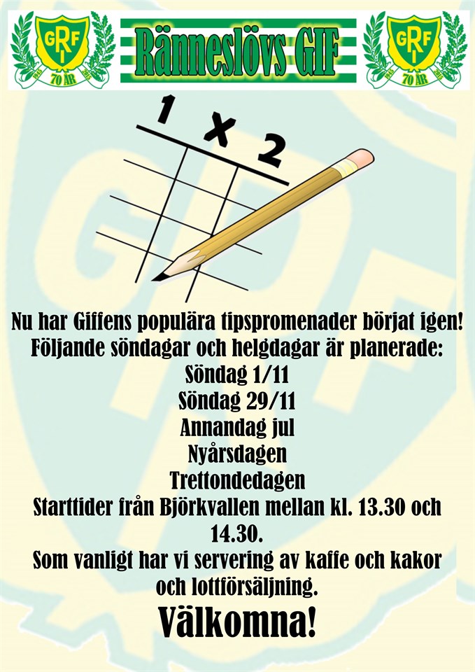 Nu har Giffens populära tipspromenader börjat igen! Följande söndagar och helgdagar är planerade framöver: Söndag 1/11 Söndag 29/11 Annandag jul Nyårsdagen Trettondedagen Starttider från Björkvallen mellan kl. 13.30 och 14.30. Som vanligt har vi servering av kaffe och kakor och lottförsäljning. Välkomna!